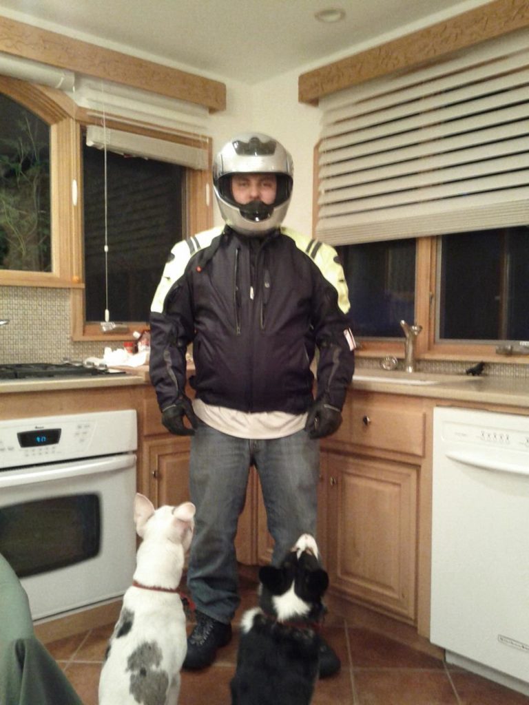 Getting ready to take the motorcycle out for a spin. Safety first!